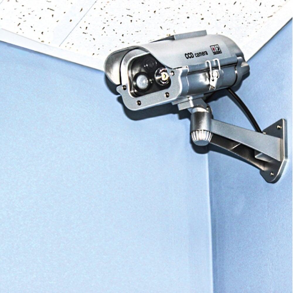 The dummy camera features a solar-powered motion-activated strobe light that will flash whenever motion is detected within a 15-foot range. The solar-powered LED light eliminates the cost of replacing batteries; if used outside the sun recharges the included rechargeable batteries. If you want to use this model indoors you can insert 3 AA batteries to provide direct power to the unit without any recharging. The dummy camera features a solar-powered motion-activated strobe light that will flash whenever motion is detected within a 15-foot range. The solar-powered LED light eliminates the cost of replacing batteries; if used outside the sun recharges the included rechargeable batteries. If you want to use this model indoors you can insert 3 AA batteries to provide direct power to the unit without any recharging.